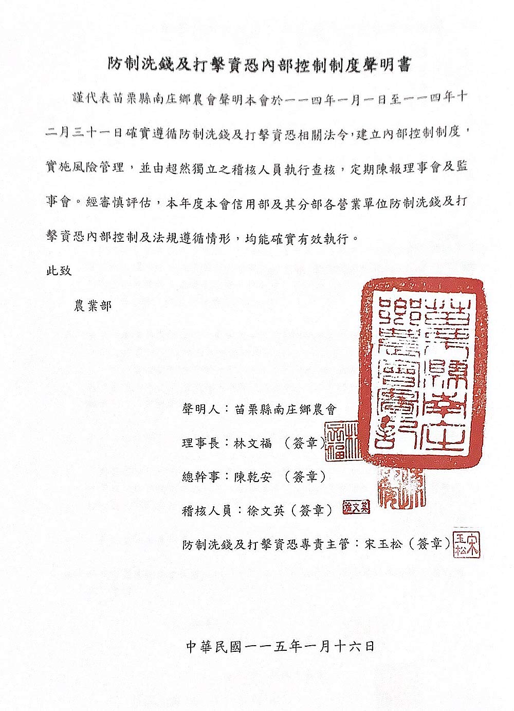 公告:防制洗錢及打擊資恐內部控制制度聲明書